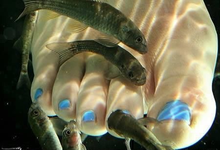 شخص پاهایش را در حوضچه آب پر از ماهی های کوچک قرار میدهد. این ماهیهای کوچک گارا روفا (Garra rufa) نام دارند که به دکتر ماهی هم معروف هستند.